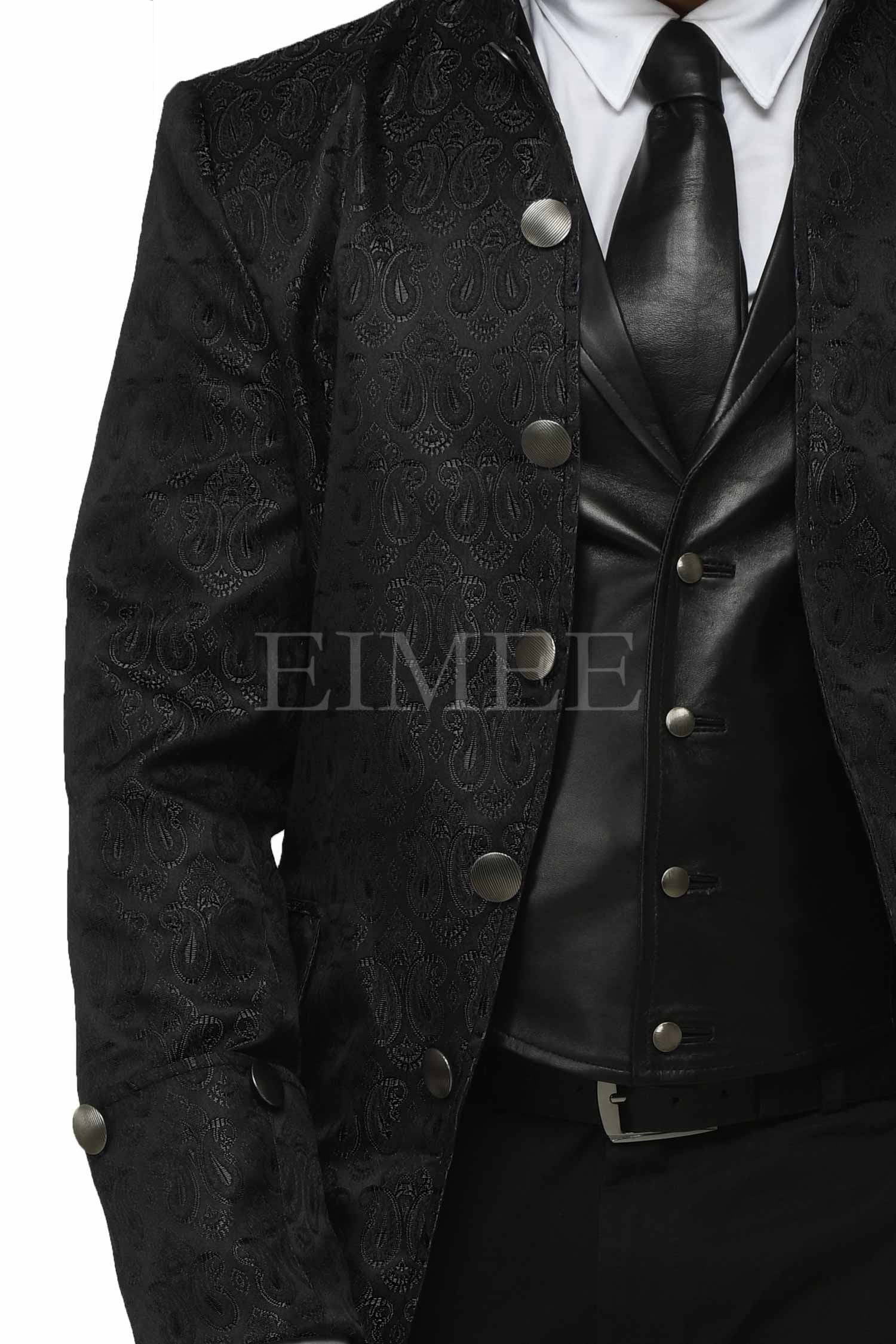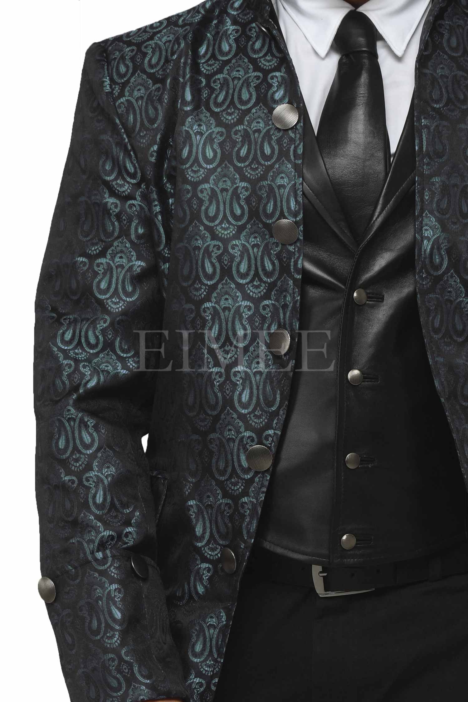 This is an absolutely stunning frock coat in black green blue purple color selection. Passionate in colors, this deluxe vintage frock coat style knee-length finished in brocade fabric. A custom Victorian style frock coat with an open front and mandarin style collar.